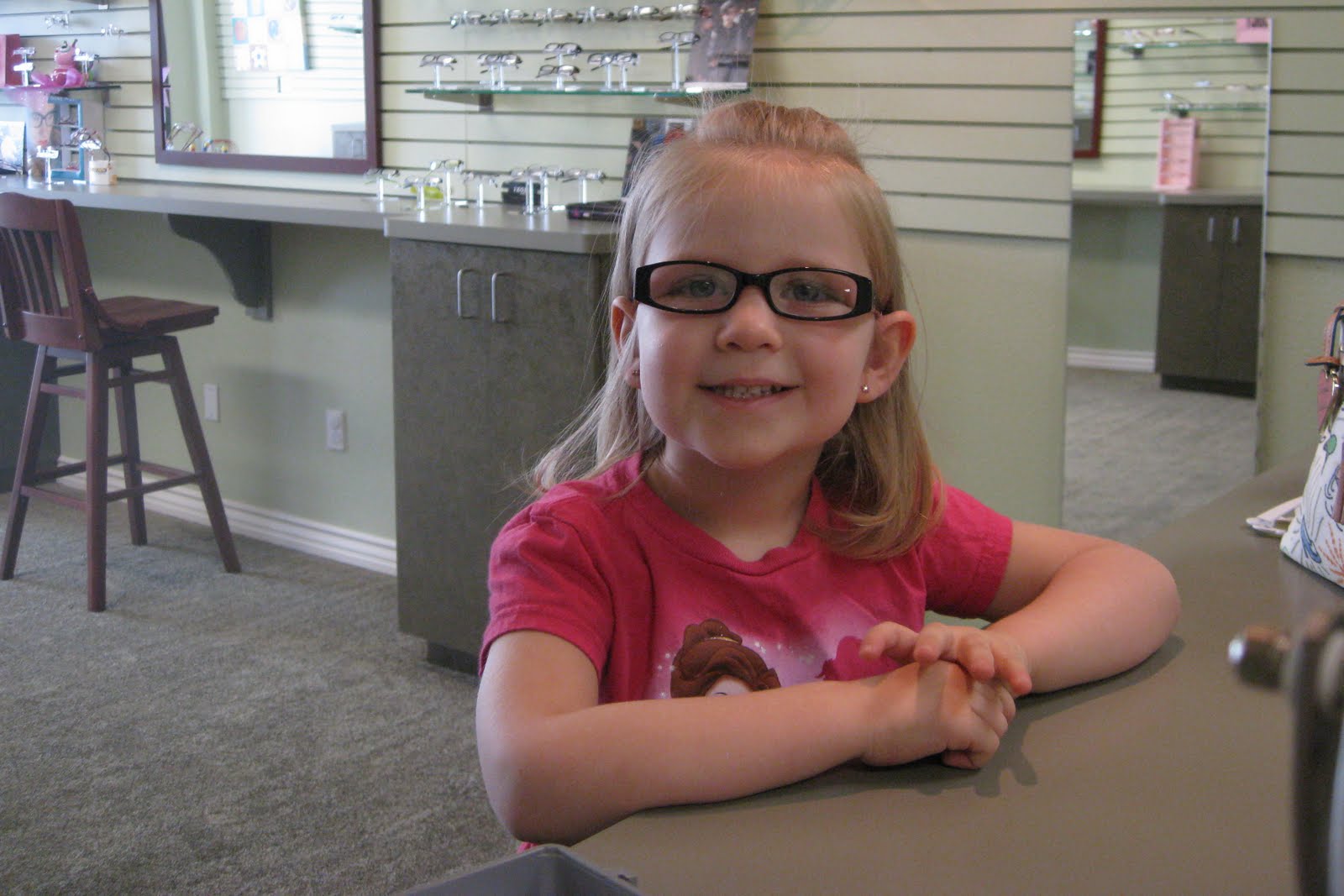 Her glasses are Disney Princess glasses, Belle, and her glasses case is a Disney Princess purse. Perfect for Peyton, right?